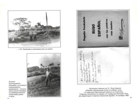 Пляж стал значительно ближе, когда мы окончательно поселились на плато. Здесь, в свободной обстановке, мы осваивали и местные обычаи и испанский язык. Серьезное отношение к изучению языка можно подтвердить. У меня в библиотеке хранится букварь испанского языка для англичан, изданный в 1894 году и приобретенный у букиниста возле отеля Гавана Либре, а также брошюрка страниц на 15 - Ruso Espanol, изданная священником (судя по подбору слов), но имеющая дарственную надпись на испанском: «Товарищу Анатолию на память от товарища Реиналдо Роке. Да здравствует Советско-Кубинская дружба. 16 октября 1962». Открыв эту брошюру сейчас, я обнаружил в ней, забытый сложенный листок с «Canto a la Sovietica». Возможно, эта кантата и не опубликована. Спасибо, Реиналдо! До Карибского кризиса оставалось менее десяти дней.