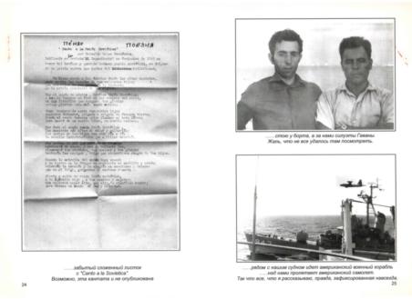 Американские самолеты не давали нам покоя, облетывая корабль вдоль и поперек, нагло и бесцеремонно. Очевидно, они опасались, что мы зайдем в другой порт и разгрузимся. Наконец, мы легли на курс по направлению к Европе. Началась идиллия - солдатам было разрешено выходить из трюмов, загорать на солнышке, развешивать портянки и пр.. Я жил в каюте второго или третьего помощника механика. По утрам нас будили с помощью советских радиопередач, которые радист записывал ночью. Однажды, я проснулся очень рано, будучи недовольным треском динамика. Но вскоре понял, что голос раздается из-за борта на ломанном русском языке: «Наше правительство, ваше правительство договорились: открывайте ваш товар, мы будем снимать кино». Это повторялось несколько раз, как запись на пластинке. Выглянув через иллюминатор, я увидел, что рядом с нашим судном идет американский военный корабль. Американские моряки также как и наши полуодетые солдаты высыпали на борт и с любопытством разглядывали друг друга. У меня сохранилась фотография этого корабля. На одной из мачт хорошо виден кинооператор с камерой. И, удача фотографа, над нами пролетает американский самолет. Так что все, что я рассказываю, правда, зафиксированная навсегда.